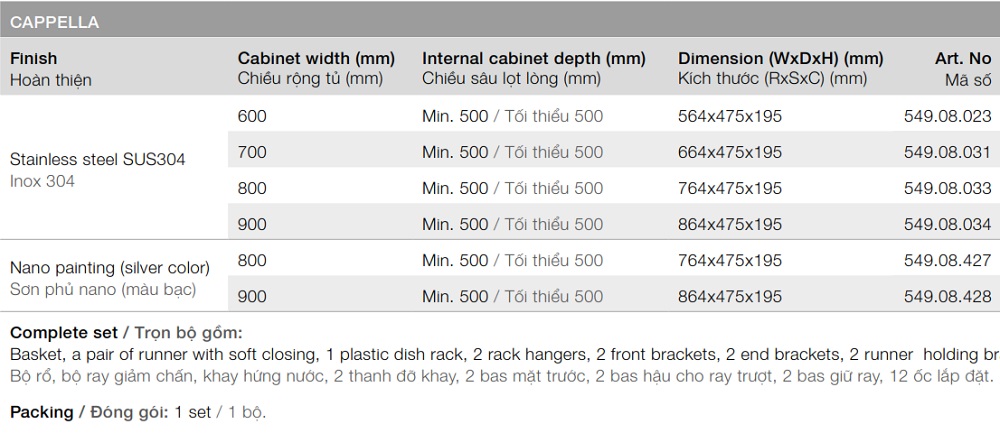 » Trọn bộ gồm: Bộ rổ, bộ ray giảm chấn, khay hứng nước, 2 thanh đỡ khay, 2 bas mặt trước, 2 bas hậu cho ray trượt, 2 bas giữ ray, 12 ốc lắp đặt.